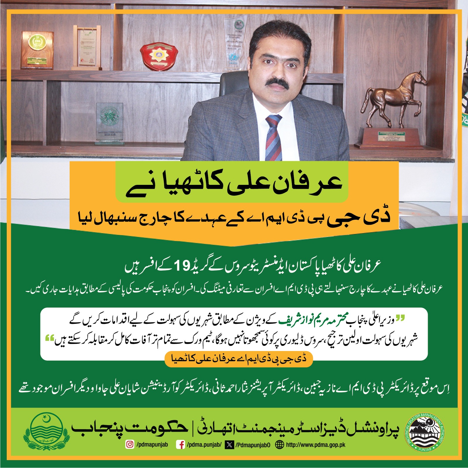 Irfan Ali Khan has assumed charged of Director-General of PDMA.