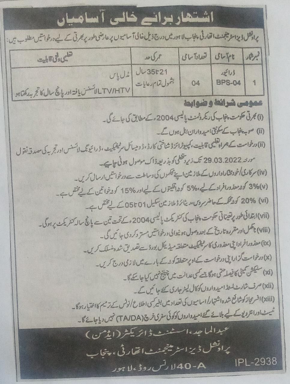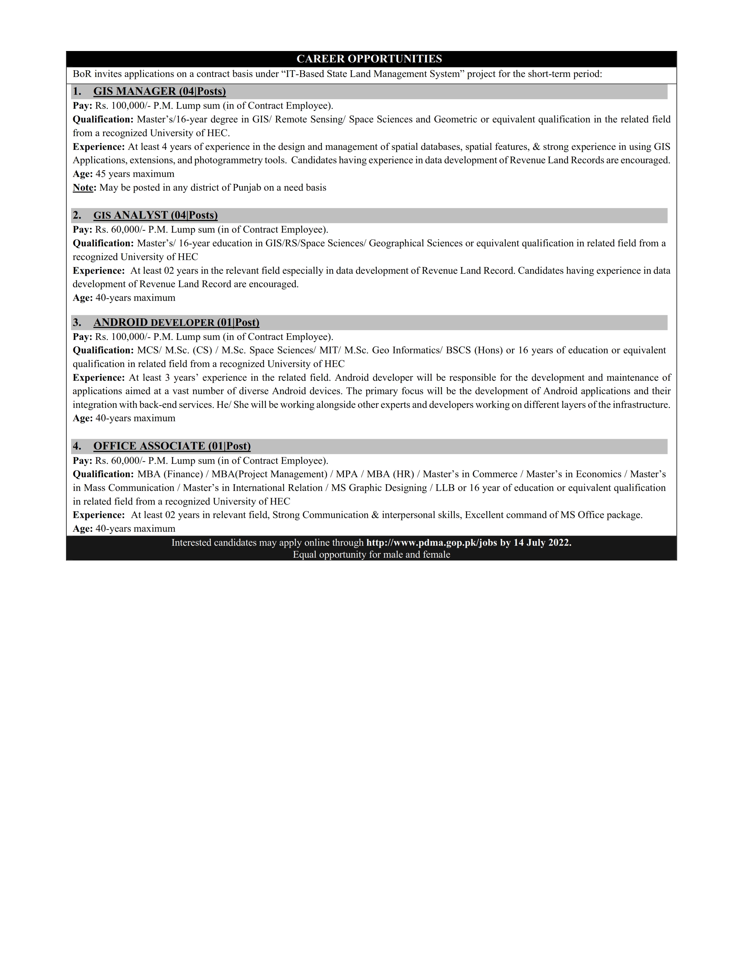 PDMA Punjab seeks highly motivated, creative, energetic, innovative and self-disciplined employees to help us meet our challenging mission. As Provincial Disaster Management Authority, PDMA Punjab is a coordinating body which provides a platform for all departments to come together and strategize management and response to disasters and calamities, we need dedicated individuals who believe in taking our mission forward. At PDMA Punjab, we work together to build, sustain and improve our capability to prepare for, protect against, respond to, recover from, and mitigate all disasters. If you have what it takes to be successful in the highly demanding but immensely satisfying emergency management career environment, we encourage you to join us and help us take our mission forward.